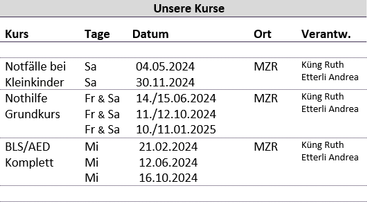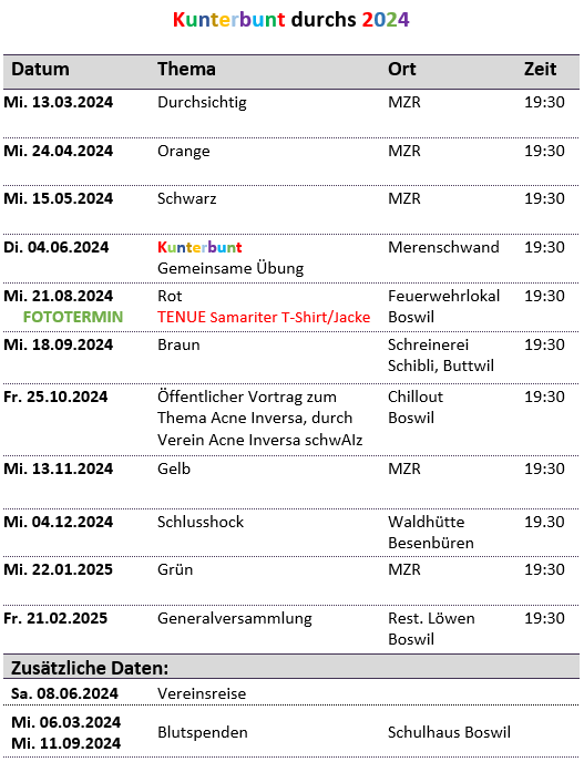 Die Übungen finden - sofern nicht anders kommuniziert - im Mehrzweckraum in Boswil statt.